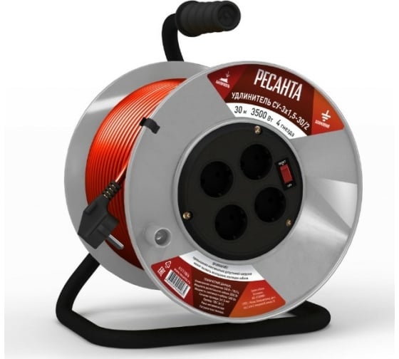 Удлинитель силовой на катушке Ресанта СУ-3х1,5-30/2 (с выкл., 4 розетки)