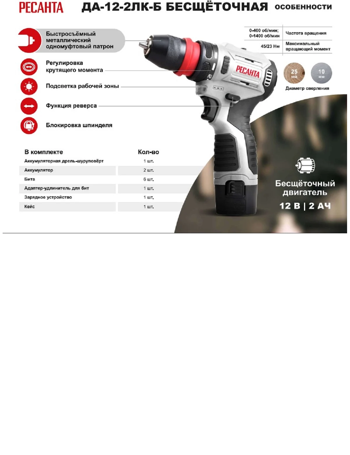 Две скорости — 0—400 об/мин и 0—1400 об/мин, что увеличивает гибкость настройки под разные типы материалов и режимов работы. Максимально возможный диаметр сверления в дереве — 25 мм, в металле — 10 мм, что позволяет применять инструмент для решения большинства повседневных задач. Функция реверса ускоряет процесс выкручивания крепёжных элементов.