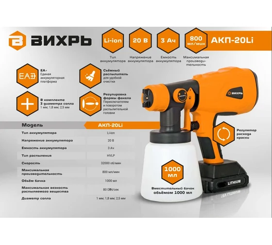 Краскопульт аккумуляторный Вихрь АКП-20Li (1 АКБ и ЗУ)