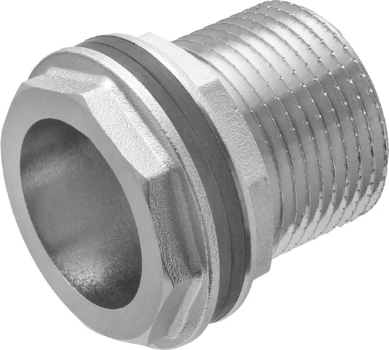 Конструкция состоит из штуцера, 2 прокладок для герметизации и прижимной гайки. Перед монтажом детали в емкости следует проделать отверстие необходимого диаметра (с учетом размера резьбовой части). Следующий шаг — зафиксировать основную часть врезки с прокладкой с внутренней стороны бака, вторая прокладка герметизирует систему снаружи. Далее остается закрепить гайку, после чего подсоединить кран, штуцеры или другие элементы. Врезка дает возможность подключить к емкости любое резьбовое соединение (штуцер для шланга, водозапорная арматура).
