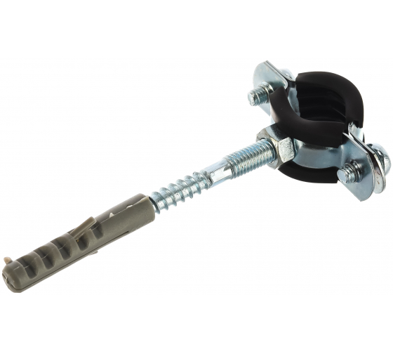 Стальной кронштейн используется в качестве неподвижной опоры при креплении к несущей поверхности труб из различных материалов и представляет собой снабженный резиновым уплотнением металлический хомут с гайкой, болтом и дюбелем. Металлические детали хомута - корпус, приварная гайка, винты - выполнены из стали и защищены от коррозии цинкованием. Для усиления конструкции число ребер жесткости увеличено до четырех, сверхпрочное сварное соединение обеспечивает надежный контакт гайки и хомута, увеличенная выточка под винты придает дополнительную прочность крепления. Винты с увеличенной головкой и комбинированным шлицом создают дополнительную прочность резьбового соединения и позволяют использовать инструмент любого типа. Увеличенная длина винтов позволяет использовать хомут в расширенном диапазоне размеров труб, наличие стопорной шайбы из полистирола не позволяет винту выпадать из отверстия.