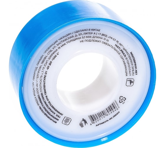 ФУМ лента MasterProf большая 19 мм х 0,1 мм х 15 м ИС.130217 - это эластичный, прочный, химически стойкий, сохраняющий свойства в широком диапазоне температур герметик, которые применяется для создания герметичных резьбовых и фланцевых соединений в сантехнических и газопроводных соединениях. ФУМ лента выполнена из фторопласта, материала, который характеризуется текучестью и гидрофобностью, что позволяет заполнять собой любые зазоры и поры в соединениях труб. Лента не изнашивается со временем и не теряет своих свойств, а также не рвется при растяжении.