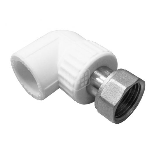 Угольник с накидной гайкой — двухсторонний полипропиленовый фитинг для соединения под углом 90° друг к другу полипропиленового трубопровода и компонента инженерной системы с резьбовым подключением. Монтаж осуществляется с помощью накидной гайки.