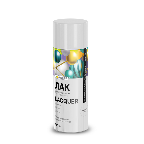 Лак аэрозольный ЛАКРА LACQUER:  Универсальный акриловый, атмосферостойкий для внутренних и наружных работ. Высококачественный универсальный быстросохнущий акриловый лак Лакра Lacquer используется в декоративных работах, строительстве и ремонте. Предназначен для создания защитного покрытия и придания блеска. Применяется для деревянных (мебель, двери, деревянные панели), металлических, пластиковых, стеклянных и минеральных поверхностей (керамика, камень, бетон, кирпич).