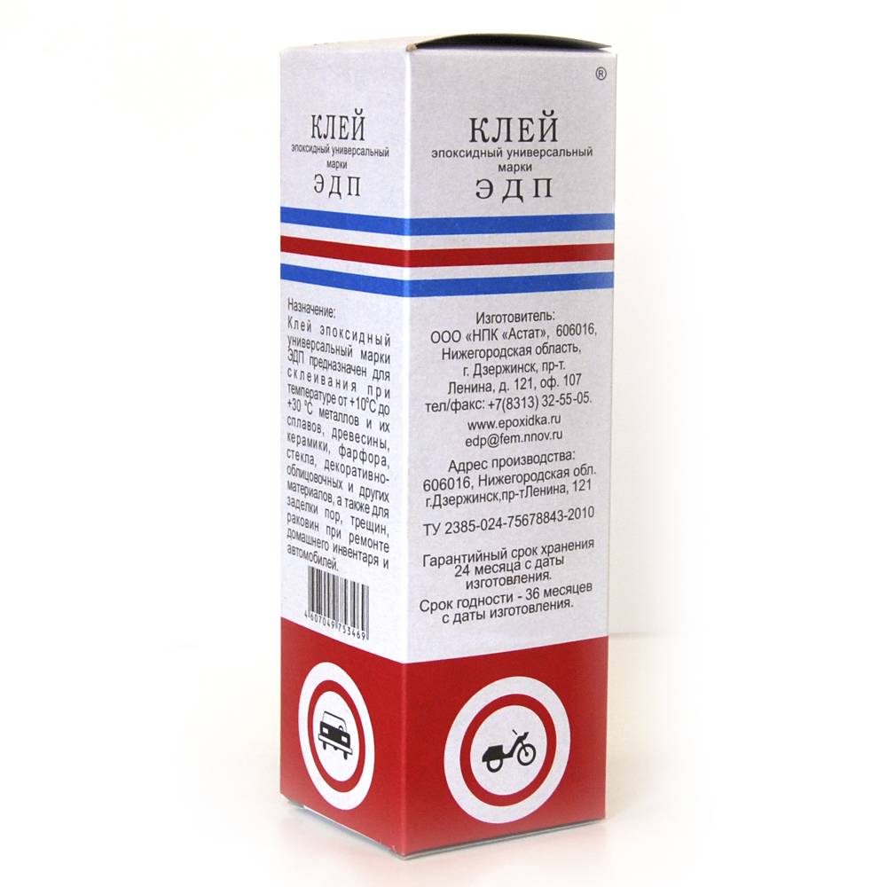 Эпоксидный универсальный клей ЭДП предназначен для склеивания металлов и их сплавов, древесины, керамики, фарфора, стекла, декоративно-облицовочных и других материалов, а также для заделки пор, трещин, раковин при ремонте домашнего инвентаря и автомобилей.
