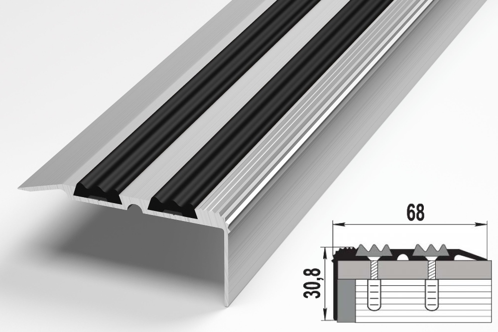 Внешний угол (накладка на ступень) - 68х30,8 мм. С двумя вставками из ПВХ черного и серого цвета, которая предохраняет от скольжения, а также выполняет функцию грязезащиты. Имеет скрытые монтажные отверстия.
