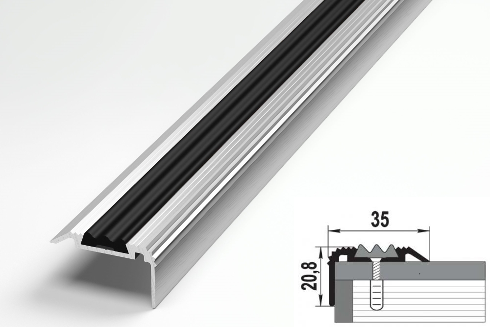 Внешний угол (накладка на ступень) - 68х30,8 мм. С двумя вставками из ПВХ черного и серого цвета, которая предохраняет от скольжения, а также выполняет функцию грязезащиты. Имеет скрытые монтажные отверстия.