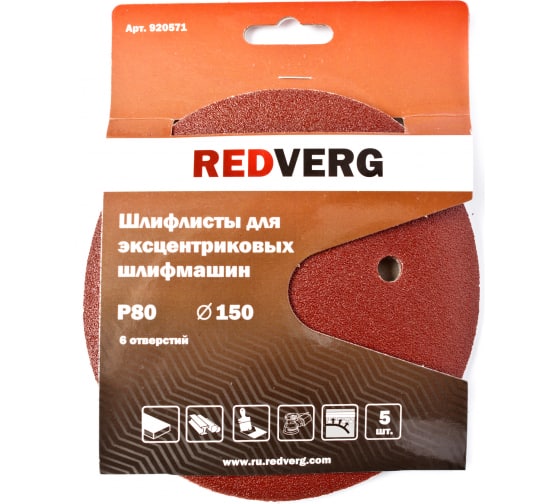 —Круги шлифовальные Redverg с отверстиями (липучка),125мм, Р100 (5шт)