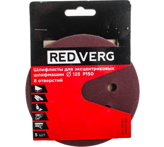 —Круги шлифовальные Redverg с отверстиями (липучка),125мм, Р150 (5шт)