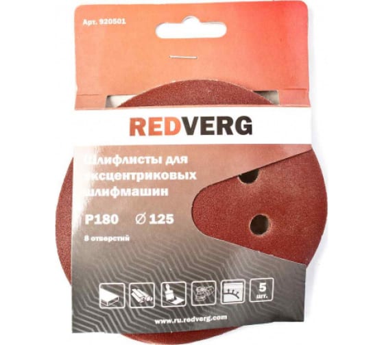 —Круги шлифовальные Redverg с отверстиями (липучка),125мм, Р180 (5шт)
