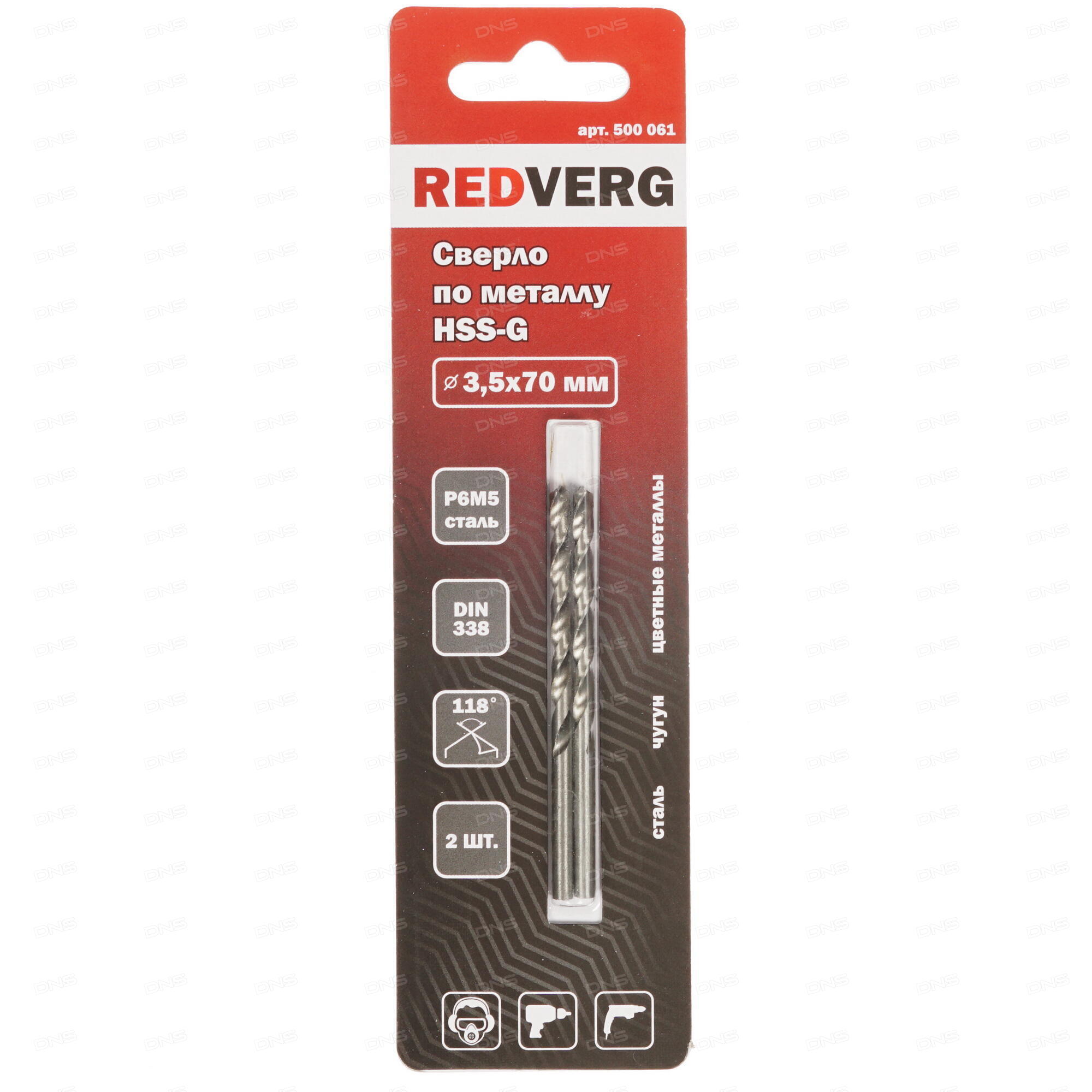 Набор сверл RedVerg 500061 содержит оснастку для работы по металлу, рассчитанную на проделывание отверстий в заготовках из сталей, чугуна, меди, алюминия и цветных сплавов. В комплект вошли два винтовых сверла с диаметром рабочих частей 3.5 мм, изготовленных из быстрорежущей стали марки Р6М5. Благодаря наконечнику с углом заточки режущих кромок 118 градусов каждая такая насадка уверенно засверливается на разных поверхностях и эффективно проникает в материал.