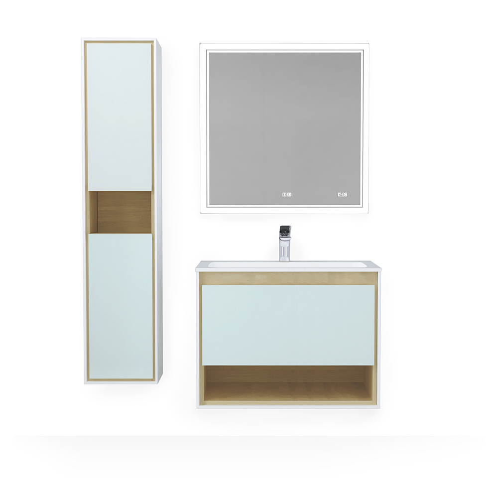 Комплект выполнен в современном стиле. Фактура дерева деликатно скрыта в белом лаконичном корпусе тумбы и элегантно сочетается с натуральным зеленоватым оттенком стекла.