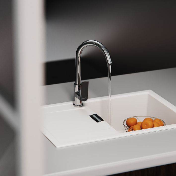 Смеситель для кухни с поворотным изливом серии AMA - Глянцевый блеск хромового покрытия наполнит пространство безупречным блеском и защитит корпус смесителя от коррозии. Управление температурой и мощностью напора производится с помощью одного рычага. Водосберегающий аэратор предотвращает разбрызгивание и способствует бережному расходованию воды.