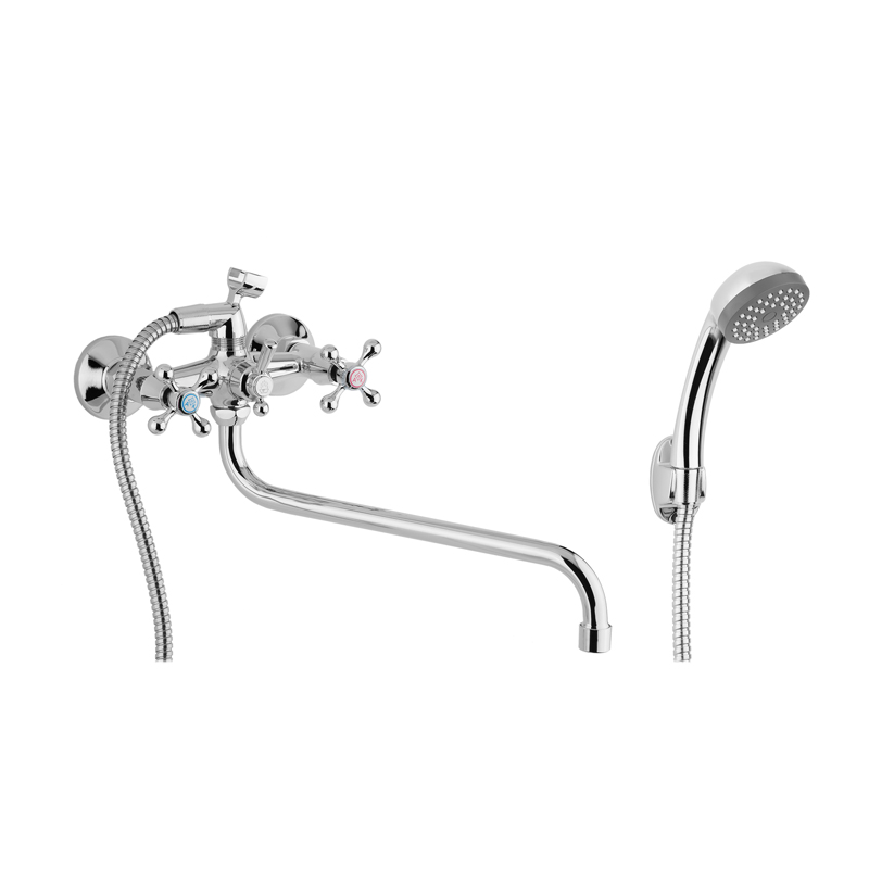 Смеситель для ванны с круглым, поворотным изливом и укомплектован шлангом для душа и лейкой. Размер излива 350мм. В смесителе установлена кран-букса АК-01 (180°, 1/2", 20 шлицов); дивертор 360гр.
