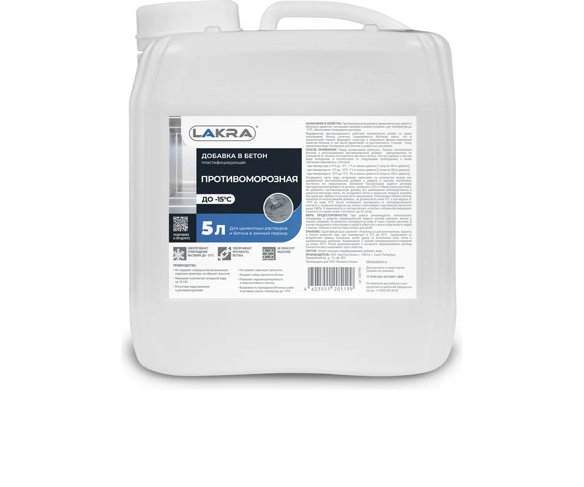 Противоморозная добавка применяется при работе с бетоном и цементно-песчаными смесями в зимних условиях, при температуре до -15°С, обеспечивая отверждение раствора.