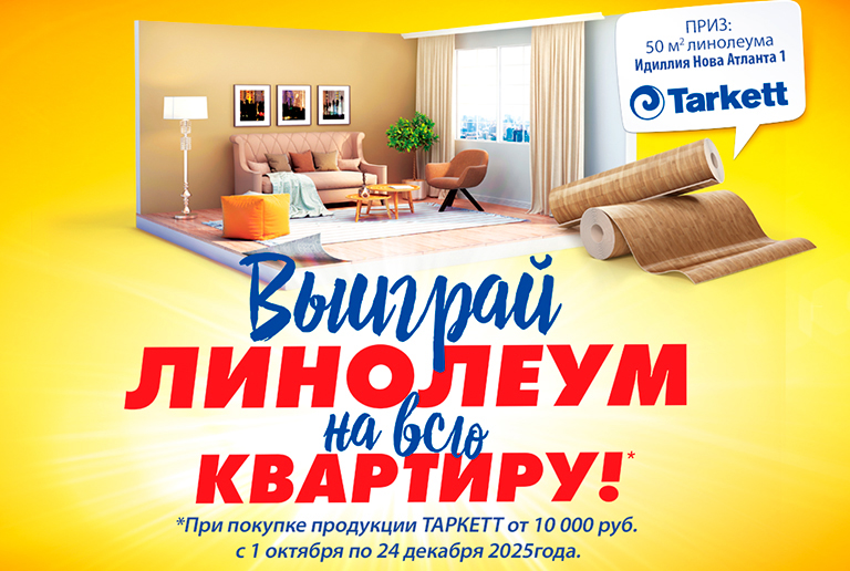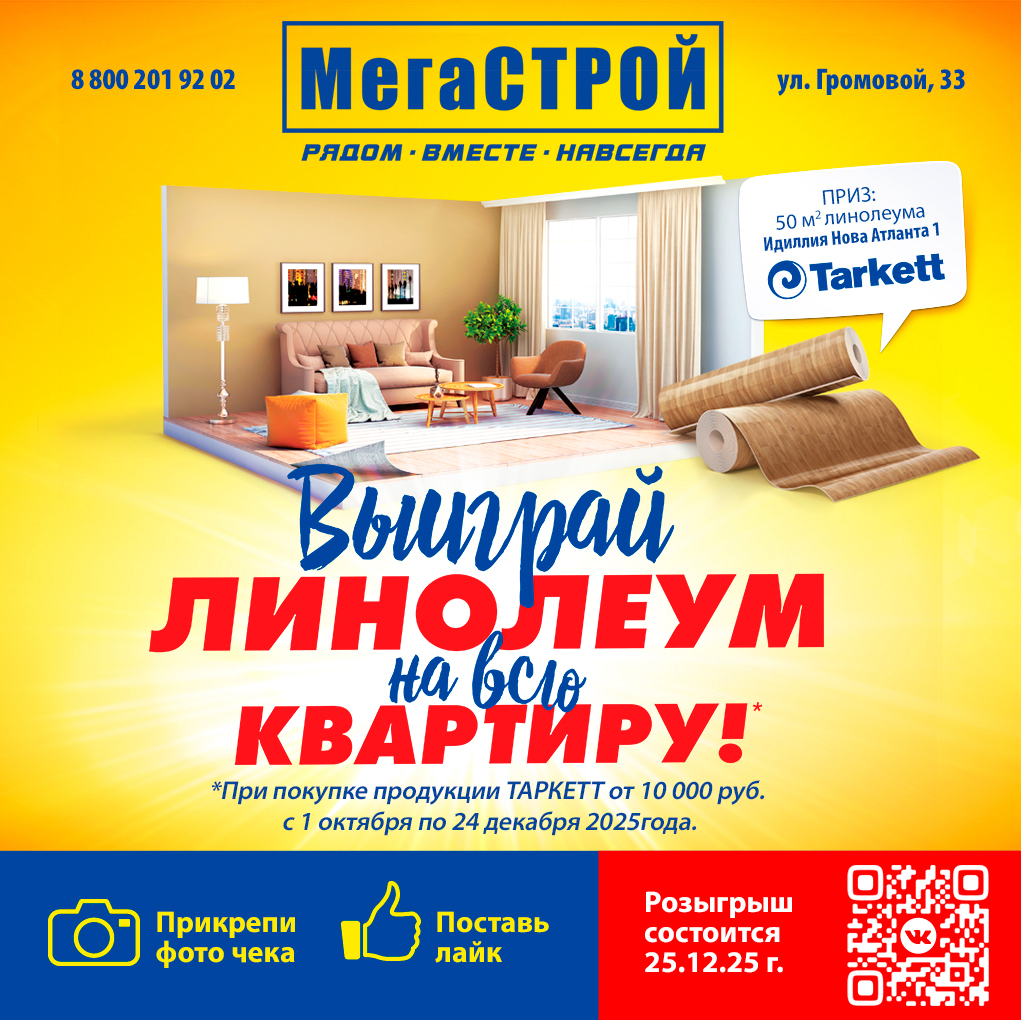 Розыгрыш проходит среди покупателей МегаСТРОЙ (ул.Громовой,33), совершивших покупку продукции Tarkett на сумму от 10 000 руб. с 1 октября по 24 декабря 2025 года